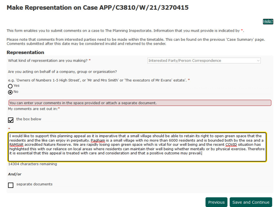 TO GIVE YOU AN IDEA OF WHAT YOU MIGHT CONSIDER, HERE IS A PHOTO OF WHAT I WROTE THIS MORNING ON MY SUPPORT (REPRESENTATION) TO GIVE YOU CONFIDENCE ON HOW EASY THIS IS, DO NOT COPY BUT WRITE IN YOUR OWN WORDS YOUR THOUGHTS AND FEELINGS OVER WHY YOU DO NOT WANT TO LOSE GREEN AND OPEN SPACES IN PAGHAM