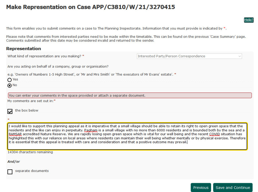 Hi Guys … PAGAM would like you to spend no more than 10 minutes of your time BEFORE the 17th. June 2021 to support the Planning Appeal that is taking place with respect to providing and retaining green space in Pagham, specifically at Summer Lane. Developers do not want to provide green space as it reduces the amount of houses it can deliver, green space is an inconvenience to their profits so we need you to rally round by clicking on the following link. This will take you to the Government’s Planning Inspectorate web site where you can SUPPORT (not object) this planning application appeal. It is very simple to do, just fill in your details and email address and remember to tick the checkboxes that you are a INTERESTED PARTY, remember to click "save and continue" prompts, and when it tells you to enter your comments in the box below, TICK "the box below" and the comments box will appear for you to enter your thoughts, SO EASY. If you are unsure what to put, scroll down, look at what I wrote this morning which is guidance only, not to copy. We need huge sustained support for this please.