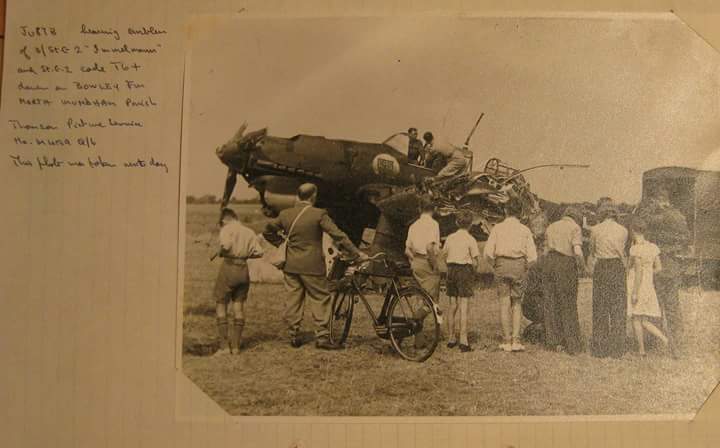 "The plane that Ron Lane says crashed in the field 15 yards in from Hook Lane was actually a fighter, not a bomber, although I don't know the make (German). The plane that crash landed on Bowley Farm at about 1305 hours on the 16th of August 1940 was a Stuka JU87 bomber. It had just taken part in the devastating raid on Tangmere Airfield and was brought down by Flying Officer Carl Raymond Davis from 601 Squadron. One of the two man crew of the Stuka died that day and the other the next day. F/O Davis was an American , living in London who joined the Royal Auxilliary Air Force and after joining 601 Squadron was credited with nine enemy kills and was awarded the Distinguished Flying Cross. Tragically he was shot down and killed 6/9/1940, aged 29 years and is buried at St Mary's churchyard, Storrington, West Sussex.